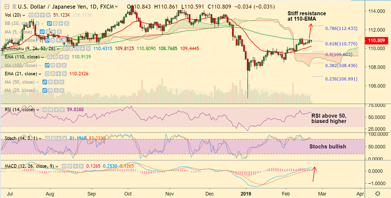 - We see stiff resistance at 110-EMA at 110.91. Breakout above will see further gains.