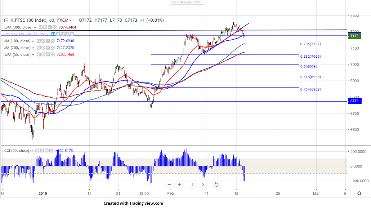 FTSE100 has halted its 2- week of uptrend and shown a minor decline. The index has formed minor top around 7261 and is currently trading around 7168.The index recovered more than 500 points from low of 6733 made on Jan 28 following footsteps of global markets.It hits low of 7162 at the time of writing and is currently trading around 7172.