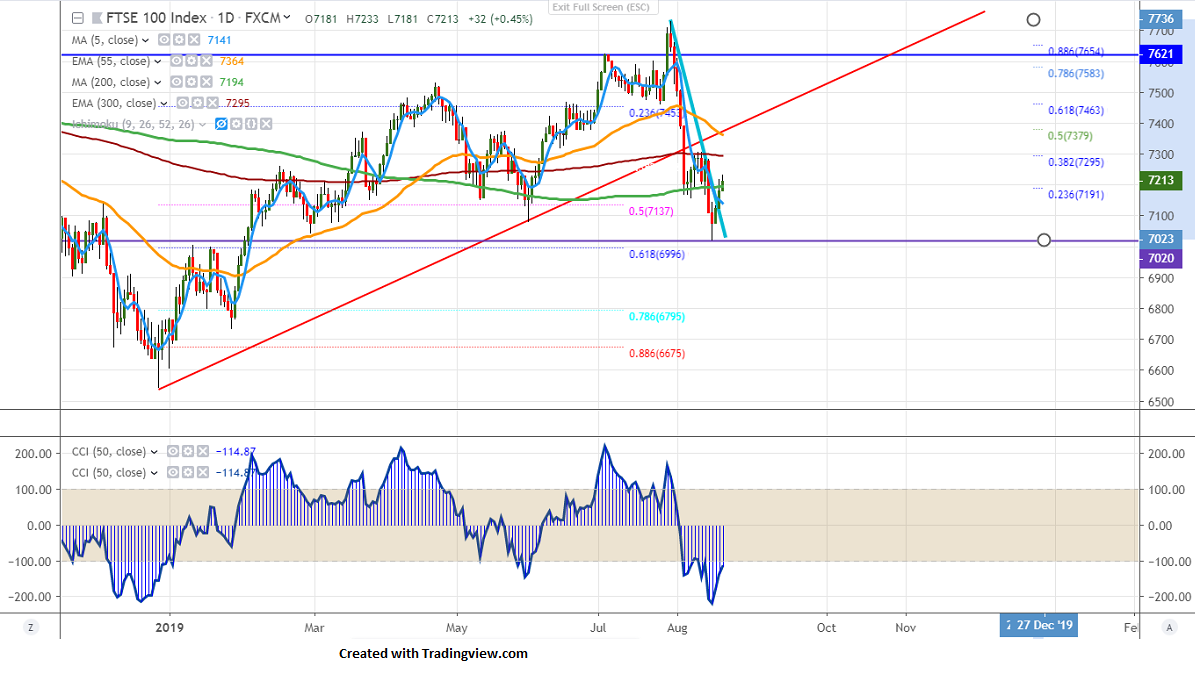 FTSE100 continues to trade higher for 3rd consecutive days and jumped more than 200 points following the footsteps of Global stock markets. The European and Asian stocks recovered on stimulus hopes from China and Germany and delay by 90 days a ban on US companies doing business with Huawei. UK index hits an intraday high of 7233 and is currently trading 7212.