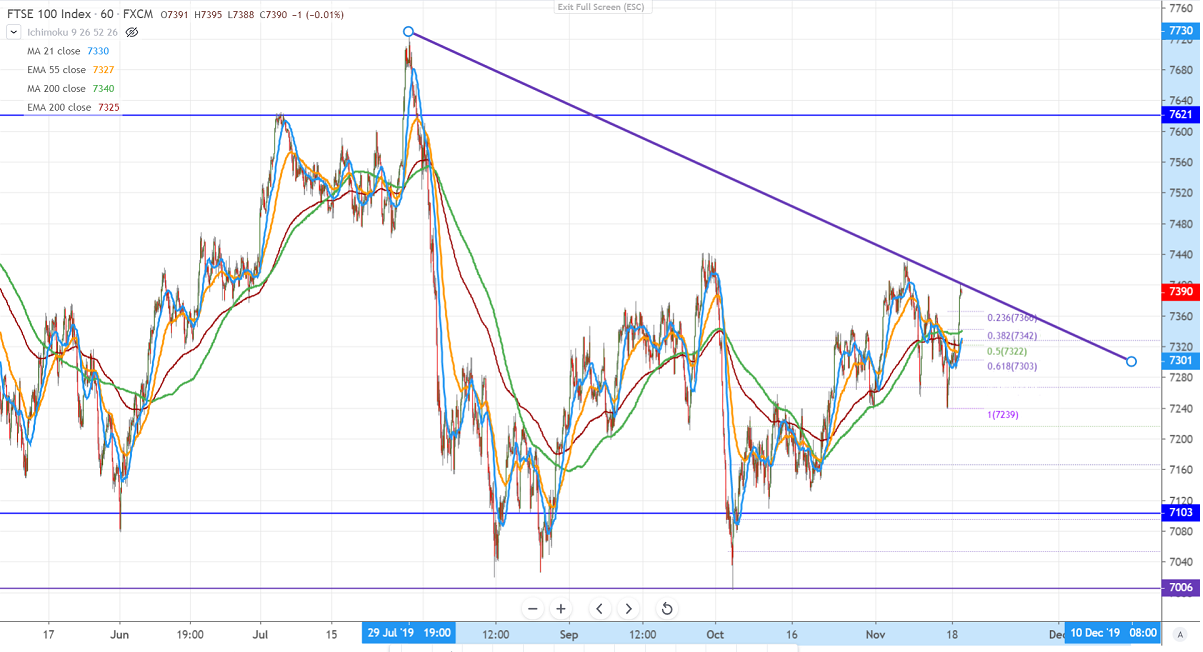 FTSE100 is trading higher and surged more than 100 points from yesterday's low of 7292. The jump was mainly due to the positive global stock market and a sharp increase in Halma share prices. The company has posted a 14% rise in pre-tax profit on account of acquisitions. The index hits high of 7404 and is currently trading around 7389.