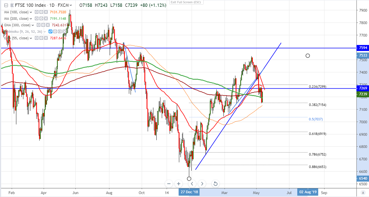 FTSE100 has shown a minor recovery after 20 day of huge selling of more than 5% on renewed US and China trade tension. US has imposed trade tariff of $200 billion Chinese goods from 10% to 25%. US markets declined more than 5% on trade escalation. It hits high of 7235 and is currently trading around 7231.