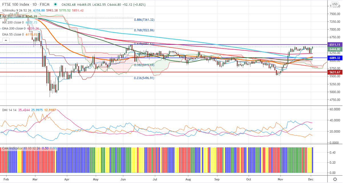 FTSE100 was one of the best performing indexes in the month of November and jumped more than 15% on upbeat market sentiment. US indices surged sharply and hits an all-time high on COVID vaccine optimism. UK government approves Pfizer and BioNtech COVID-19 vaccine is also supporting the prices. The index hits an intraday high of 6469 and currently trading around 6444.