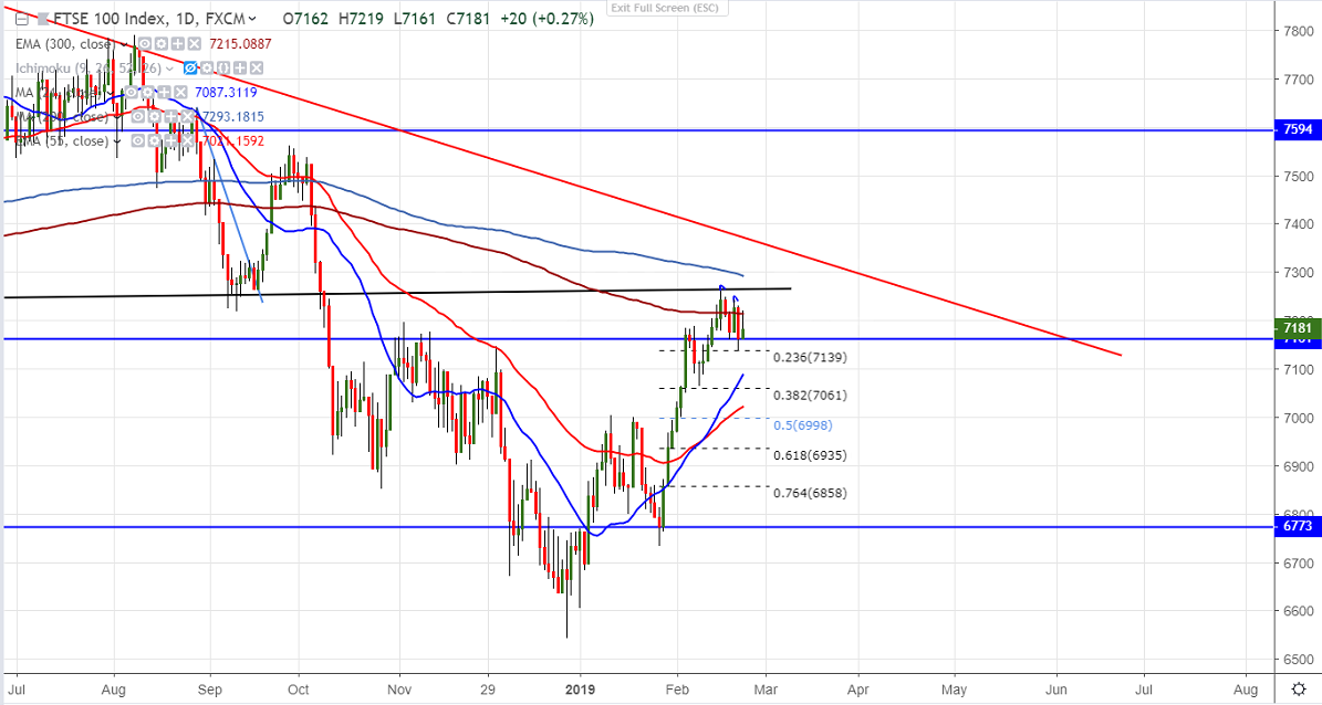 FTSE100 has declined till 7139 yesterday and shown a good jump till 7215.The index has jumped for 3rd time above 7200 level and declined from that level. The index has formed temporary top around 7261 on Feb 15th and showing minor weakness from that level.The index has jumped more than 10% in past 50 trading day on account of US-China trade talks optimism and bullish trend in global stock market. It is trading around 7180.