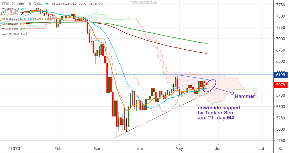 FTSE100 upward got exhausted yesterday and lost more than 200 pips from high of 6098. The global stock market sell-off due to weak US economic data is putting pressure on FTSE100. It hits a low of 5891 (Kijun-Sen) at the time of writing and recovered sharply till 5977. The candlestick pattern looks like a hammer in the daily chart.