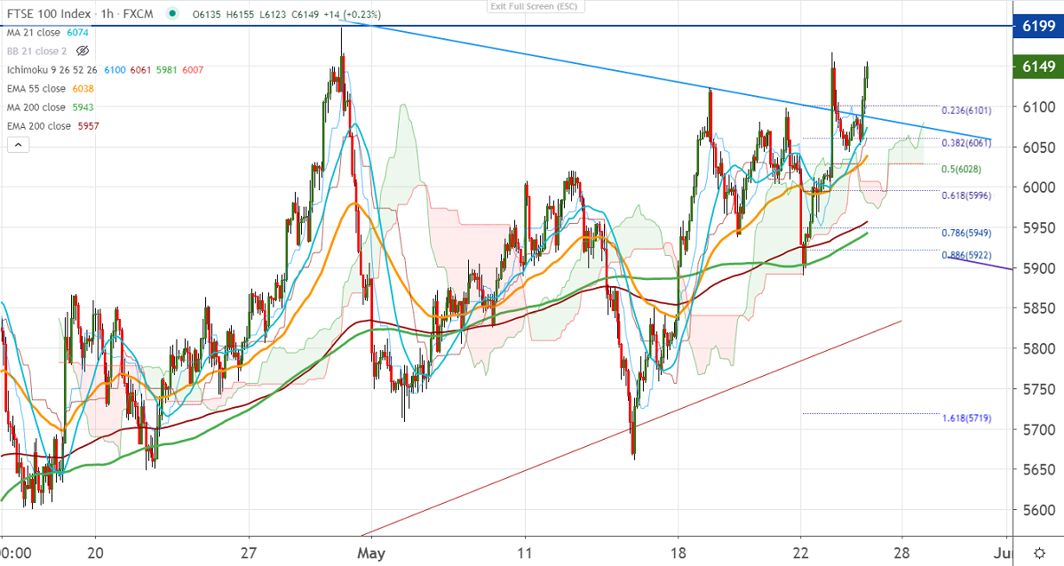 FTSE100 continues to trade higher for 4th consecutive as market risk appetite improves. The global stock market surged sharply especially S&P500 crossed major psychological level 3000. The UK index downside capped by 200-HMA and shown more than 200 points recovery. It hits an intraday high of 6155 and is currently trading around 6150.
