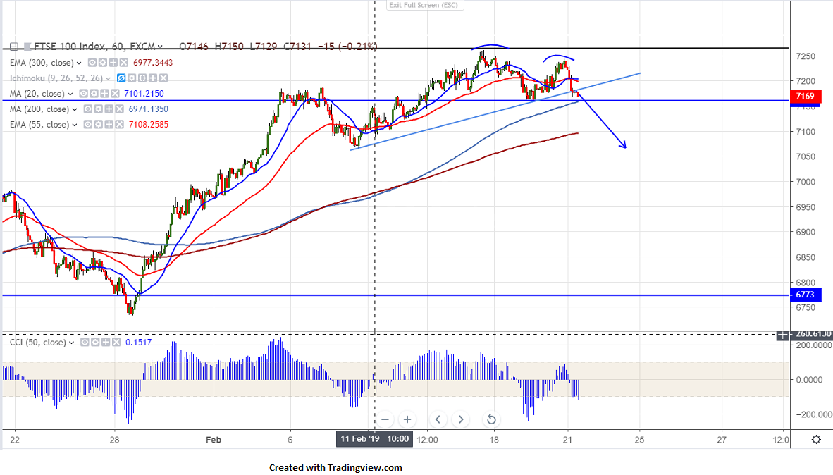 FTSE100 has once again declined after showing a jump above 7200 level. The index hits high of 7243 and declined more than 75 points from the high .FTSE100 has formed almost a double bottom around 7160.The index has jumped more than 10% in past 50 trading day on account of US-China trade talks optimism and bullish trend in global stock market. It is currently trading around 7176.