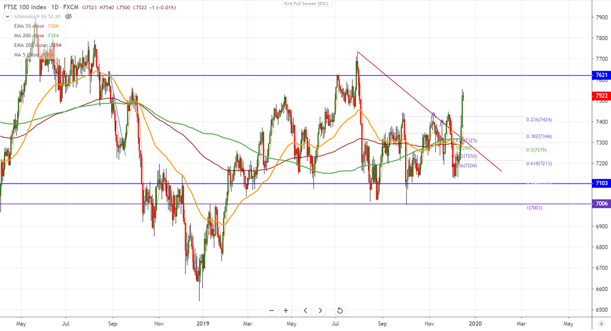 FTSE100 recovered sharply and surged more than 5.5% in the past 3 days after the UK election result and easing the US-China trade tension. The Conservatives have shown a landslide victory in election by winning 365 seats compared to the 203 Labor party. It hits high of 7554 and is currently trading around 7521.