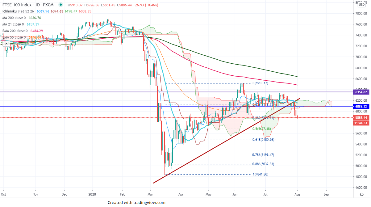 FTSE100 continues to trade weak for 2nd consecutive week and hits 6-week low at 5857. The fear of the second wave of coronavirus and UK and US trade worries is dragging the index down. The UK government is considering the worst worse scenario to lockdown London to prevent further corona spread. The S&P futures are trading flat and currently trading around 325.