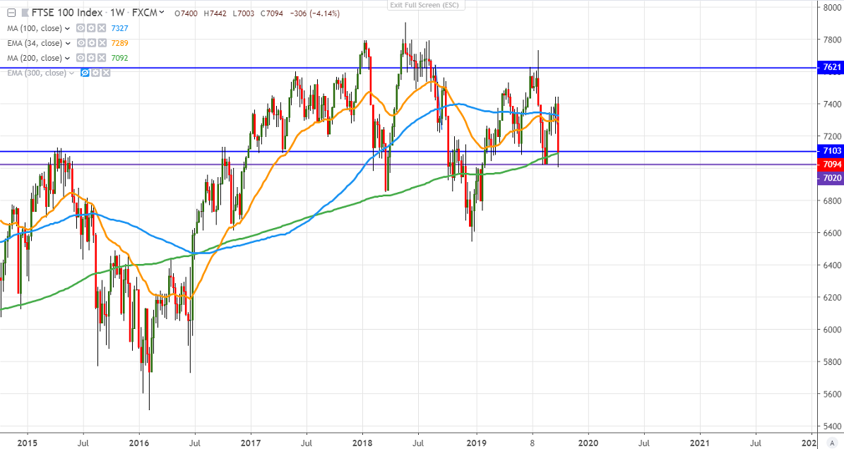 FTSE100 is one of the worst performers this week and lost more than 5% on weak global cues. The escalation of the US-EU trade war and a weak economy from the US is putting pressure on global stock markets. US ISM manufacturing and services PMI came much below expectations and markets eye US NFP data today for further direction. The index hits low of 7003 and is currently trading 7098.