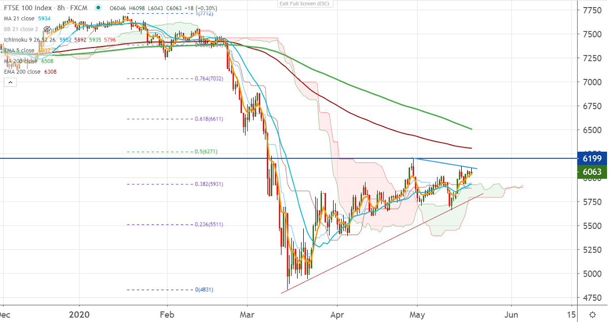 FTSE100 recovered sharply from a low of 5938 made yesterday. The Manufacturing PMI for May came at 40.6 vs forecast 35.1, better than Apr reading of 32.6. The services PMI read at 27.8 vs estimate 24.1 and notably increase from Apr's 13.4.