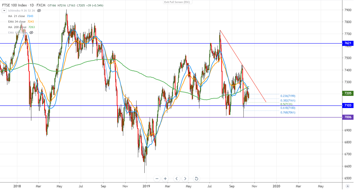 FTSE100 has once again recovered from a low of 7148 and hovering near the 7200 levels. The index is trading slightly flat on ongoing Brexit uncertainty. Pound sterling lost more than 100 pips after a massive recovery of more than 650 pips. The slight dip came after Democratic Union Party (DUP) has rejected Boris Johnson Brexit deal. UK 10-year gilts were one of the best performers this month and jumped more than 90% and spread between the yield has widened sharply to 8 bps from 1 bps.