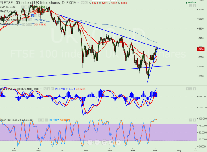 - FTSE100 has retreated after making a high of 6219. It is currently trading around 6161.