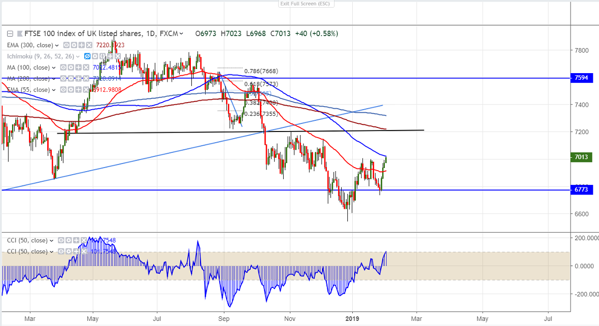 After a huge sell-off of more than 250 points FTSE100 is trading higher for four consecutive day. Global markets was trading higher after dovish Fed .US Markets recovered than 3% on account of better than earnings. Brexit uncertainty is major concern. UK wants to renegotiate the Irish backstop But EU is not willing to reopen any talks. Pound sterling lost more than 150 pips after key Copper vote on extending deadline for Britain to leave EU failed. FTSE100 hits intraday high of 7023 and is currently trading around 7011.