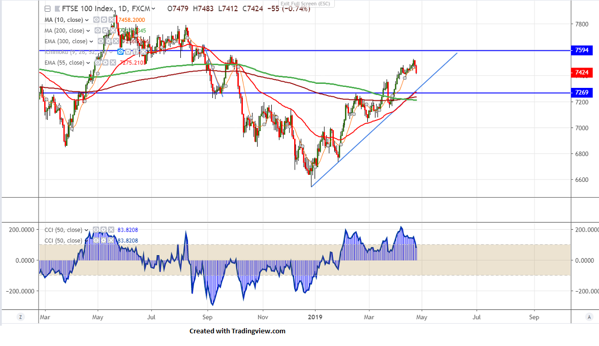 UK100 is trading lower for 2nd consecutive day and lost more than 100 point from high of 7530. the decline was mainly due to concern that China will reduce stimulus. Mining shares declined sharply as prices of base metal lost sharply in Shanghai market. US markets has closed slightly lower after hitting record high on Apr 23rd 2019.FTSE100 hits intraday low of 7411 and is currently trading around 7420