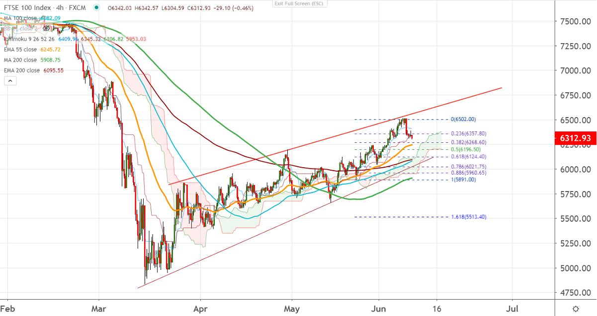 FTSE100 is trading lower for 2nd consecutive days after 3 weeks of bullishness. It has declined nearly 200 points due to profit booking in global markets. US markets especially S&P500 lost more than 1% from recent high on a slight decrease in risk appetite. The UK index hits a low of 6305 and is currently trading around 6306.25.