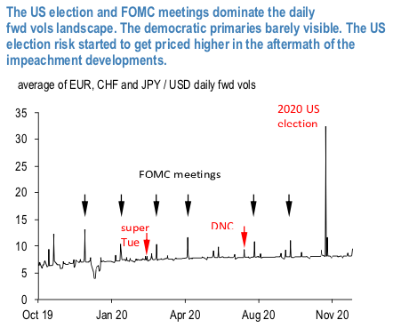 The upcoming 2020 US election pricing are gearing to be one of the most eventful in history and the notable uptick in FX options pricing of that risk since the impeachment developments comes at the 13 months mark before the election day, well ahead of any of the previous elections.