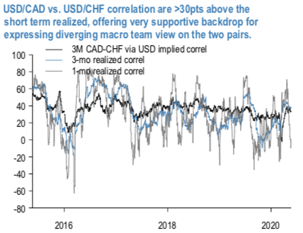 One such example is USDCHF vs USDCAD where our analysts remains bearish on CAD, with a target of a 5% drop by Sept but see CHF as the best-rated currency based on an aggregated measure of QE vulnerabilities. Level of 3M implied correlation at around 35% is by our own admission not particularly impressive; still, it offers a solid buffer for cheapening de-correlation structures. 1m realized correlations (0%), so that the time span is excluding the March high-volatility period, point to more than 30 correlation points of premium.