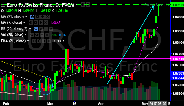 The victory of moderate candidate Emmanuel Macron in the French presidential election has allowed the Swiss franc to depreciate significantly against the euro. This reduces the SNB’s need to intervene. While we still believe the CHF will generally remain under appreciation pressure, levels around 1.09 in EURCHF should be sustained for the time being. However, we expect falling exchange rates again by the end of the year at the latest. The Swiss franc has suffered substantial losses versus the euro since the presidential election in France (refer above chart).