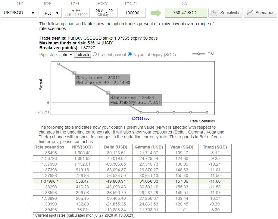 In any case, the economy is still expected to contract by around 8% this year, below the government’s -4% to -7% projection. For USDSGD, it is seemingly in a tug-of-war between USD weakness on the one hand and downside risks for SGD due to the US-China tensions on the other. For today, USD weakness is dominating with USDSGD dipping to the lower end of the 1.38 - 1.40 range of the past two months. Given the uncertainties surrounding CNY, we would be cautious in looking for much lower levels. For USDSGD, we could foresee more downside risks on the cards in the days to come. Hence, we advocate 1m ATM -0.49 delta put options to arrest bearish risks. One could observed the pay-off structure as and when the underlying spot FX keeps dipping. Courtesy: Ore & Commerzbank