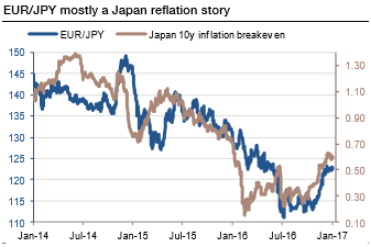 But Euro area political and US policy risks will be the immediate drivers of the euro. In the Euro area, our base case continues to be that traditional parties will prevail (The euro in 2017: Populism precedes an ECB policy shift). Immediate focus will be on the Dutch general elections (March 15th) and polls for the French elections (April-May). Given the uncertainty around US policy, positioning for Euro area political risks is better expressed through short EUR/CHF rather than EUR/USD.