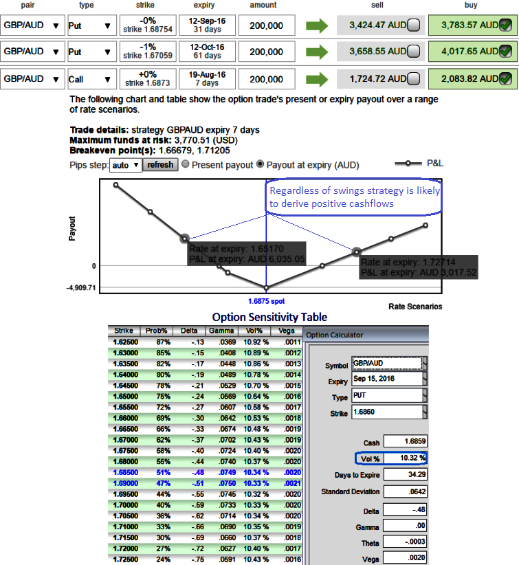 Thus, at spot ref: 1.7425 levels, as shown in the diagram the strategy could be deployed with 2 lots of longs in 1M at the money -0.49 delta puts and one can always ask – why not buy cheaper options of both the call side and the put side. Well yes you will save money but the risk will also increase, 2M (1%) out of the money -0.38 delta put option is also preferred, simultaneously, initiate longs in 1 lot of 1W at the money +0.51 delta call option at net debit.