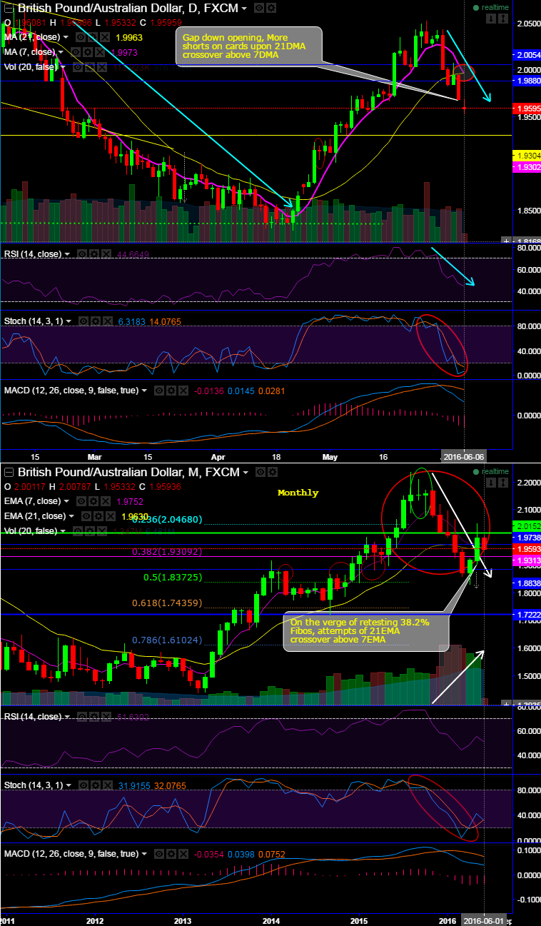 Hence, at spot ref: 1.9595 levels (while articulating) we advocate Pinocchio strategy using above/below binary puts with OTM strikes of 30-40 pips for intraday speculators in an ongoing bearish environment that are likely to fetch certain yields as we observe 1D IVs are spiking higher with sky rocketed pace ahead of significant risky event UK referendum.