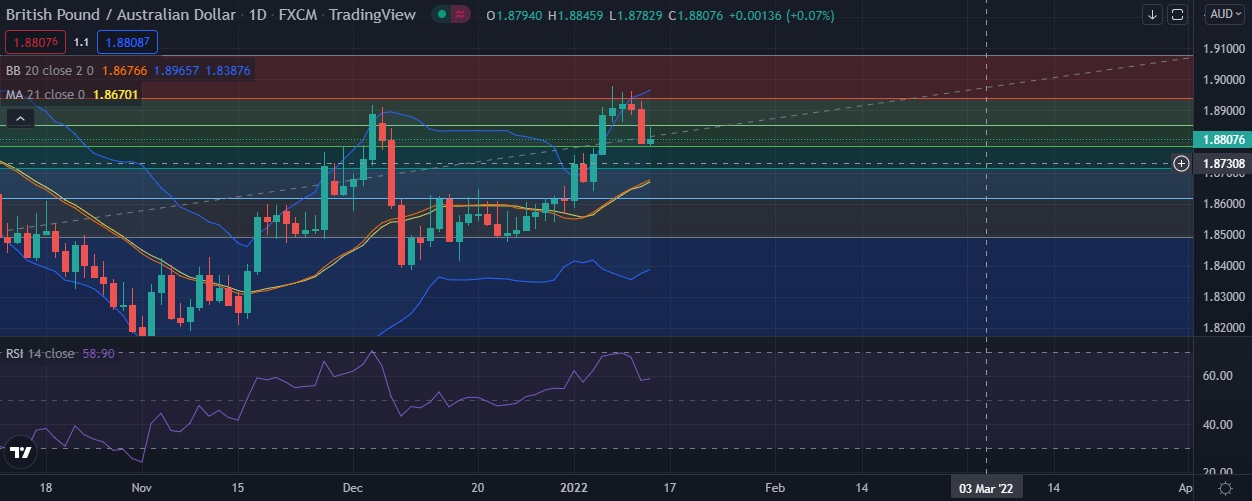 • Immediate support is seen at 1.8788 (50% fib) and break below could take the pair towards 1.8711 (61.8%fib).