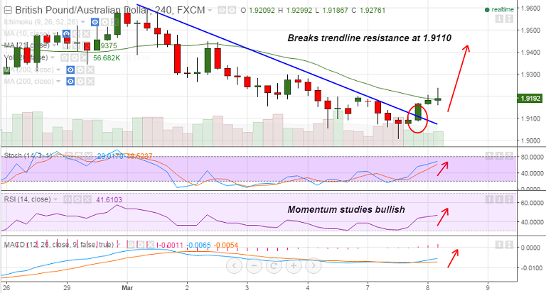 GBP/AUD has broken strong trendline resistance at 1.9110 levels, we see scope for test of 0.93 levels.