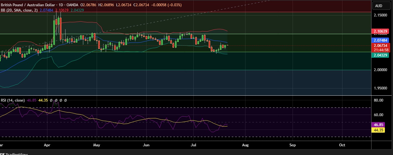 • Strong support is seen at 2.0502(50%fib) and break below could take the pair towards 2.0442(Lower BB).
