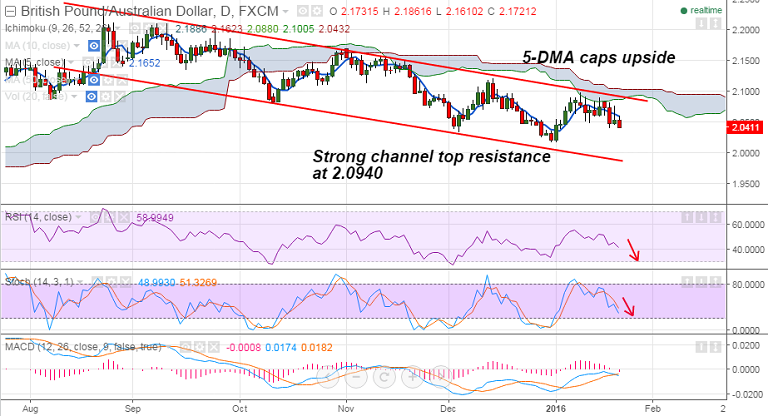 GBP/AUD has been trading a falling channel since August, 2.0940 is strong resistance, daily cloud also weighs on the topside.