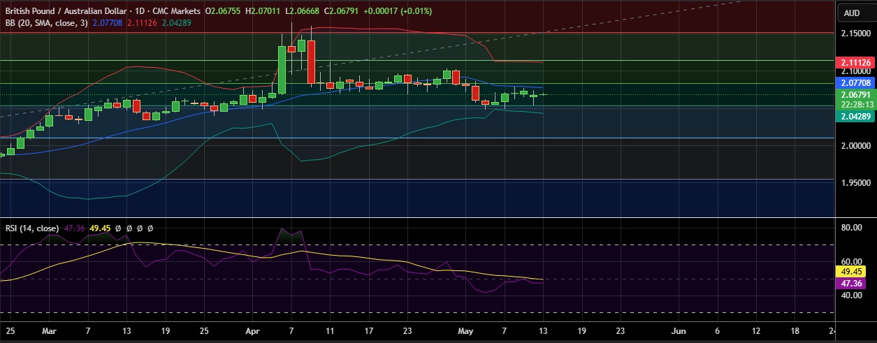 • Strong support is seen at 2.0533 (61.8% fib) and break below could take the pair towards .0421 (Lower BB)