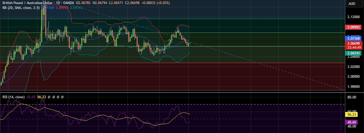 • Strong support is seen at 2.0607 (38.2% fib) and break below could take the pair towards 2.0480(Lower BB).