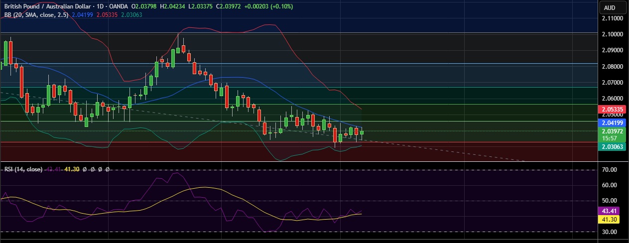 • Strong support is seen at 2.0322 (23.6%fib) and break below could take the pair towards 2.0303 (Lower trendline).