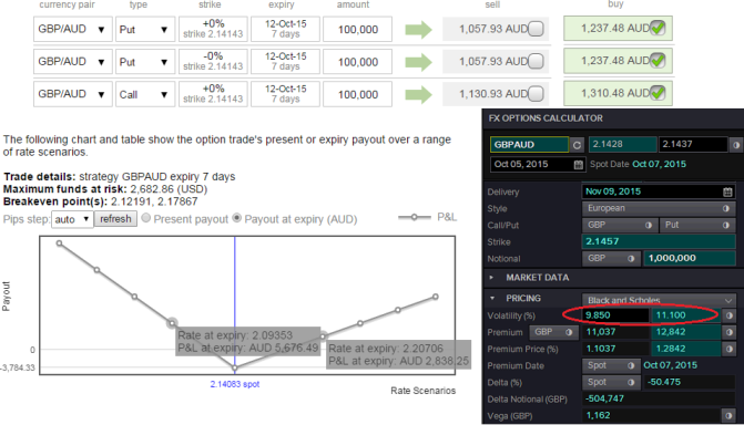 The potential target on upside is about 50-100 pips where 200-250 pips on downside, options strips are to be deployed, now have a look at the diagram fro prevailing prices of ATM puts and they are moving in line with healthy delta. First and foremost considering the prevailing downtrend and the lower implied volatility of GBPAUD ATM contracts is at 11.11% which is a good sign for option holders. We've been firm to hold on this strategy on hedging grounds, unlike spreads, combinations allow adding both calls and puts at a time in our strategy.