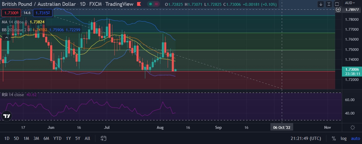 • Strong support is seen at 1.7279(23.6% fib ) and break below could take the pair towards 1.7227 (Lower BB).