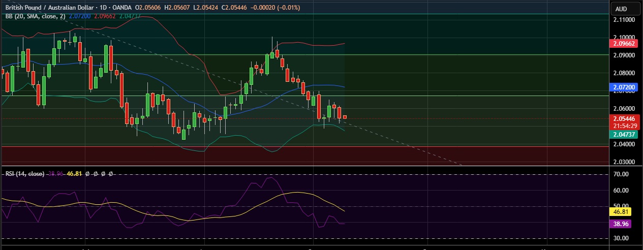 • Strong support is seen at 2.0476 (Lower BB) and break below could take the pair towards 2.0383(23.6% fib).