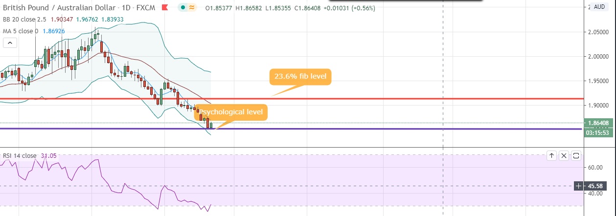 • Immediate support is seen at 1.8500 (Psychological level) and break below could take the pair towards 1.8384 (Lower BB).