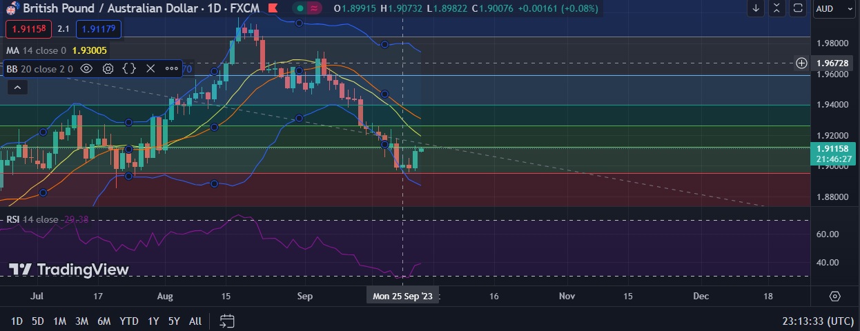 • Strong support is seen at 1.8950 (23.6% fib)and break below could take the pair towards 1.8875 (Lower BB).