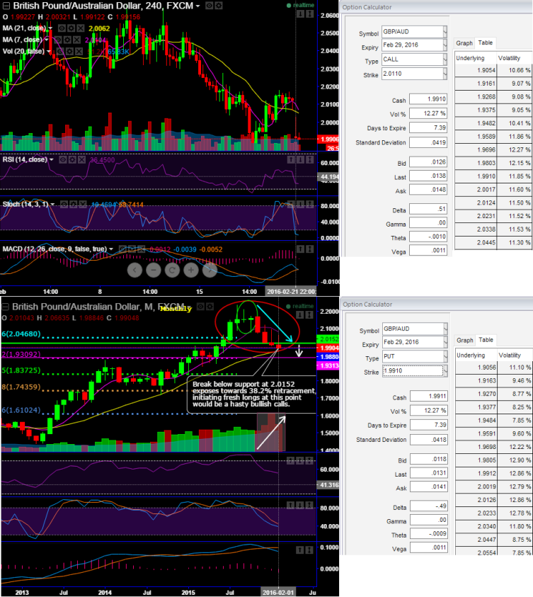 The pair has broken a support initially at 2.0152 and now at 2.0054 with a sharp gravestone doji at 1.9915 levels and it is a gap down opening (prev close - 2.0152; today's open - 1.9922) which is on the verge of testing next medium term support at 1.9747 and at 1.9313 levels which 38.2% retracements during Q2 as sterling worsening and losing its strength against Aussie dollar.