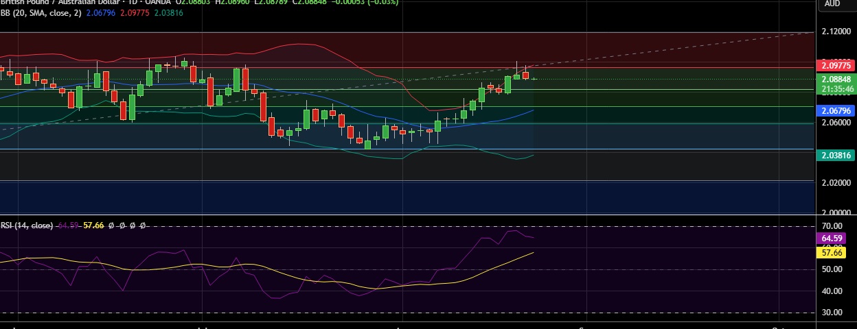 • Immediate resistance is located at 2.0954(23.6%fib), any close above will push the pair towards 2.0991 (Higher BB).