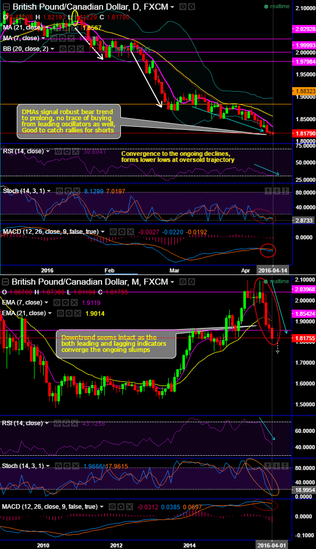 In last five months, GBPCAD has shown declines from the highs of 2.0949 to the current 1.8185 levels, (i.e. almost 13.19% and a fresh 1-year lows).