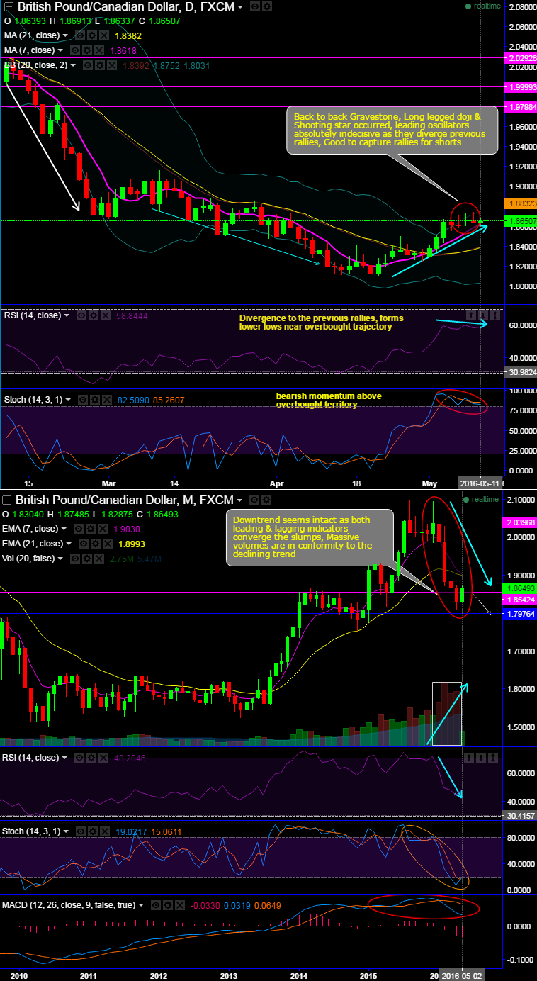 Back to back bearish candles such as Gravestone, Long legged doji & Shooting star occurred at 1.8608, 1.8670 and 1.8639 levels respectively.