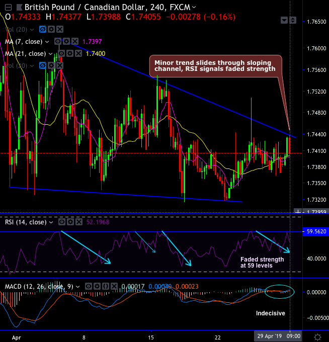 GBPCAD has formed shooting star at 1.7397 levels and the sloping channel patterns in the minor trend.