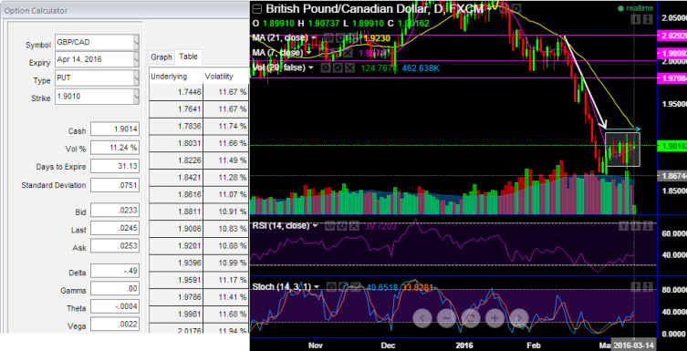 Maximum returns for the short strangle is achieved when the GBPCAD price on expiry is trading between the OTM strikes (i.e. 1.919 and 1.8775)as both the instruments have to wipe off worthless. So that the options trader gets to keep the entire initial credit taken as profit.