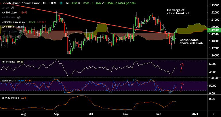 GBP/CHF has closed above 200-DMA on Tuesday's trade and is currently on verge of cloud breakout.