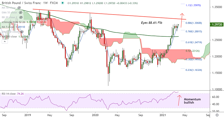 GBP/CHF was trading 0.32% higher on the day at 1.2970 at around 09:50 GMT, outlook bullish.