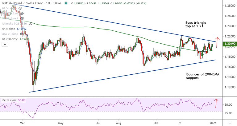 The pair is extending trade in 'Symmetric Triangle' pattern, scope for test of triangle top resistance at 1.21.