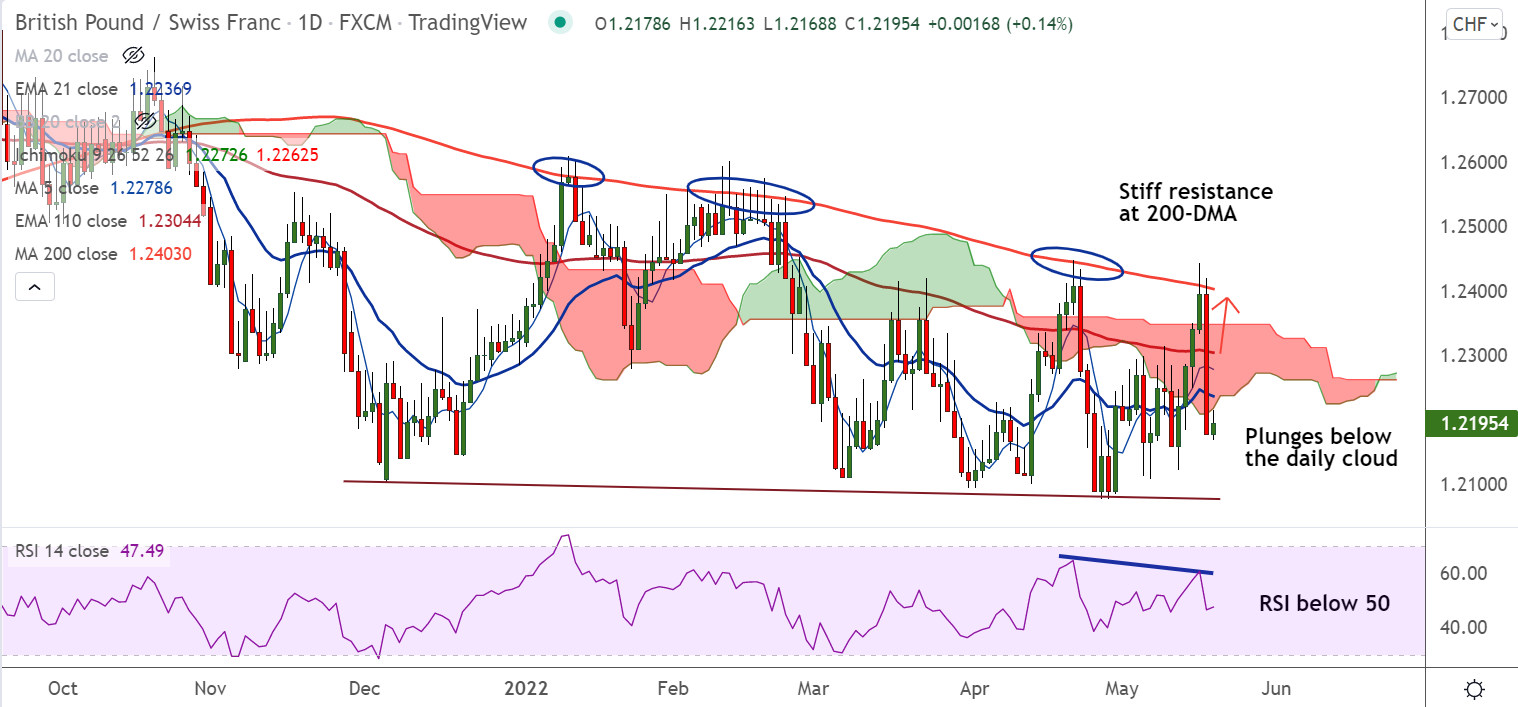 GBP/CHF was technically rejected at 200-DMA and the pair has broken below the daily cloud. Scope for test of major trendline support at 1.2075.