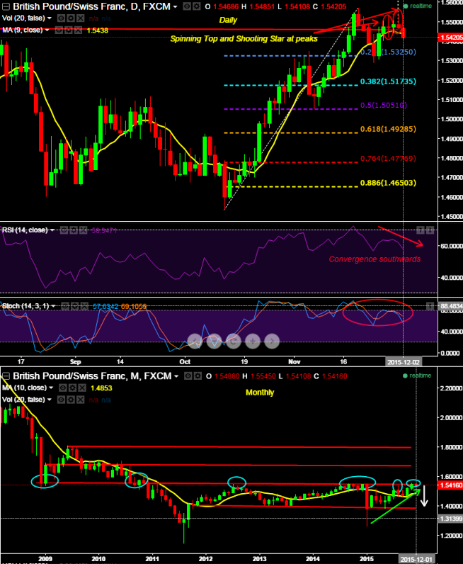 Both on weekly and monthly technicals raise a caution for ongoing uptrend as prevailing upswings have not been able to break above resistance levels at 1.5570 (see circled spots in blue).