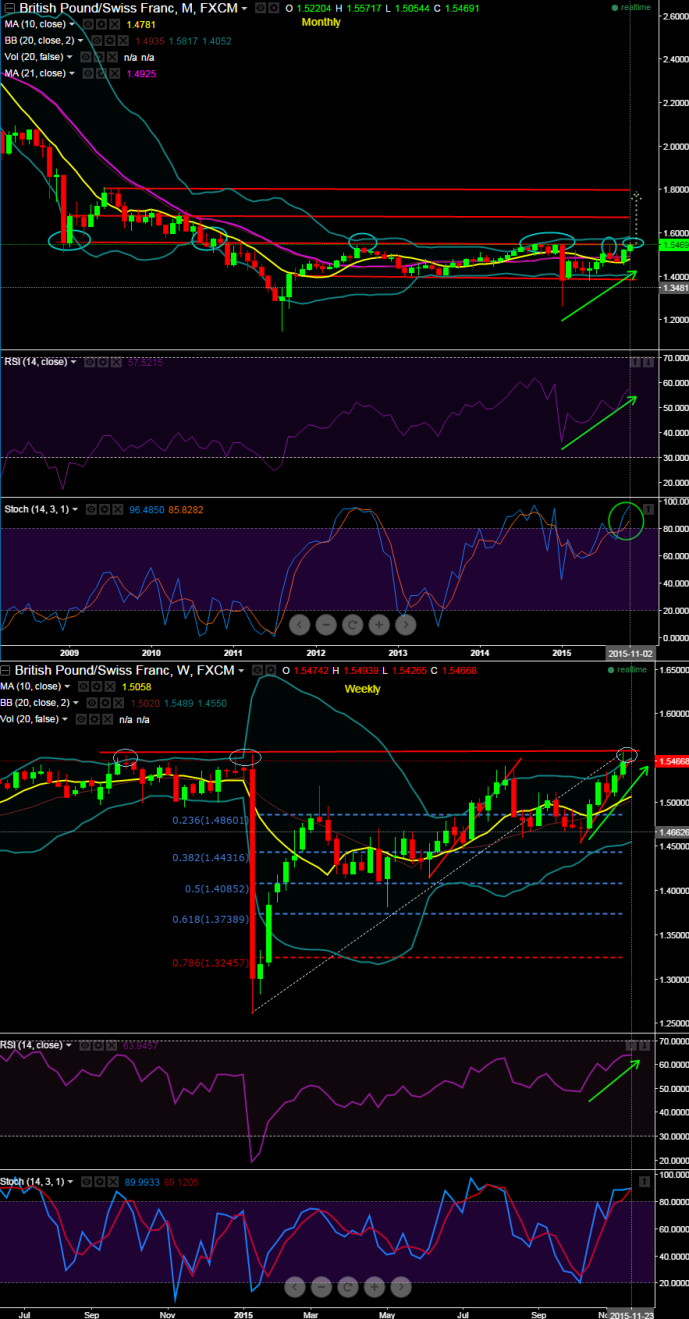 Both on weekly and monthly technicals raise a caution for ongoing uptrend as prevailing upswings have not been able to break above resistance levels at 1.5570 (see circled spots in blue).